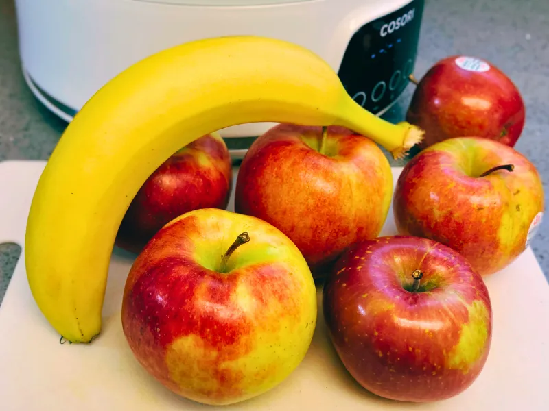 I dehydrated my apples and bananas at 135°F (63°C). Every few hours, I checked the dryness and turned the slices or rotated the trays.