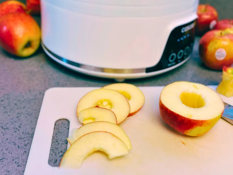 Preparing food before dehydrating consists of evenly dividing it so it can dry consistently. This usually involves slicing fruits and vegetables evenly. I cut my cored apple into 1/4-inch slices.